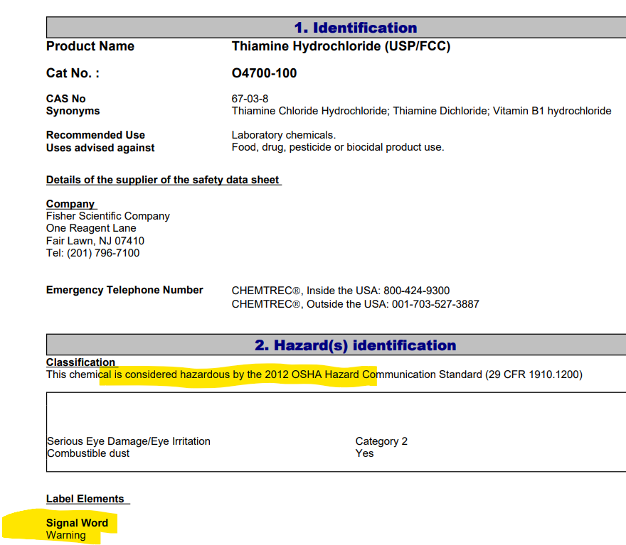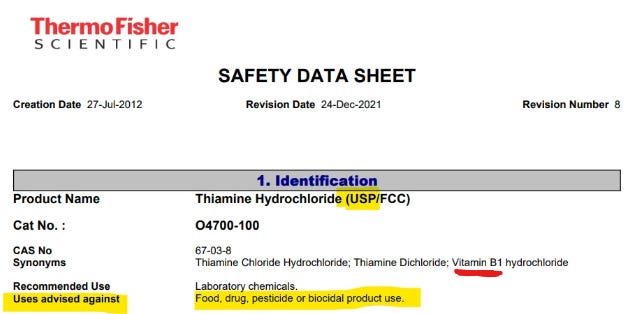 Here is the Manufacturers Safety Data Sheet for the best-of-the-best “USP” pharmaceutical grade Thiamine Hydrochloride, “Vitamin B1”. Even though this is the USP grade, meaning it is as good as it gets, it is labeled as not being fit for consumption: