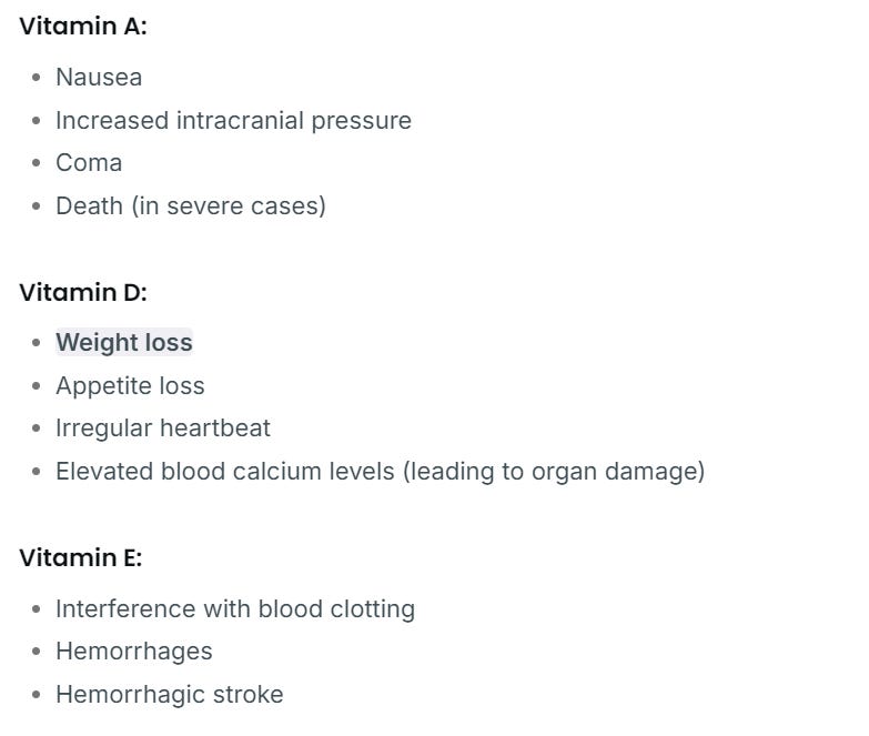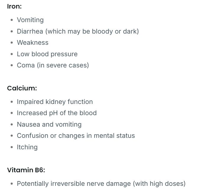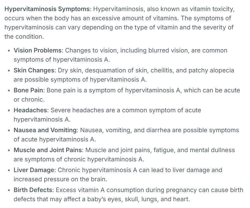 The real issues caused by supplements are severe. For example, “Vitamin A”, which is added to all dairy, cereals, nutritional shakes, white flour, edible oils and fats like margarine, baby formula, and more, if you “take too much” can result in everything from dry skin to bone pain, vision loss, headaches…