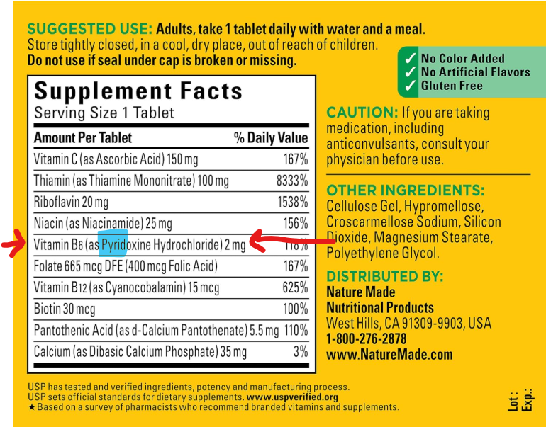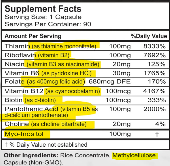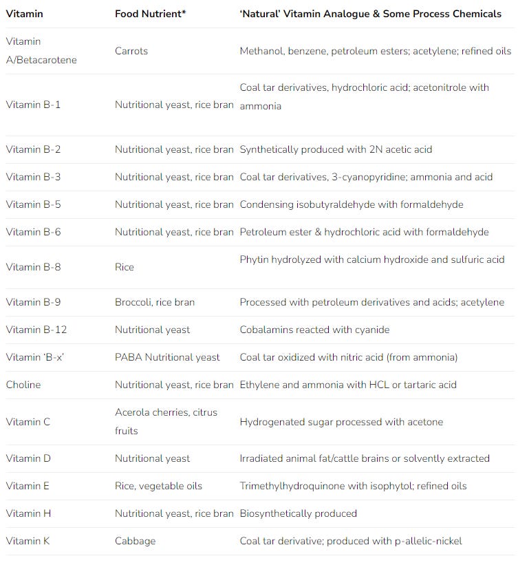 You will know these are not natural vitamins by looking at the ingredients label. Anything that says “as”, such as “Vitamin B-12 as Cyanocobalamin” means it is lab made. Anything that says HCI or is a sciencey word, like nicotinic acid, pyridoxamine or para-aminobenzoic acid means it was made by man.