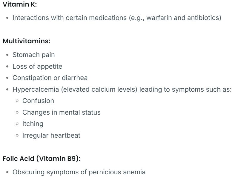 Now let’s discuss the side effects: There is no set side effect per supplement because the industry is unregulated so what you are getting is a mystery and interactions with other chemical compounds depends on your diet; someone who eats a lot of cheese is getting mega doses of so-called vitamins A & D whereas someone who eats clean but consumes a buffet of supplements is intaking a buffet of chemicals in small doses.