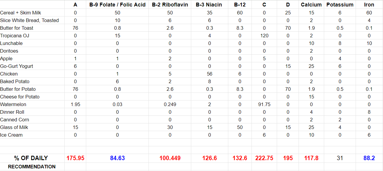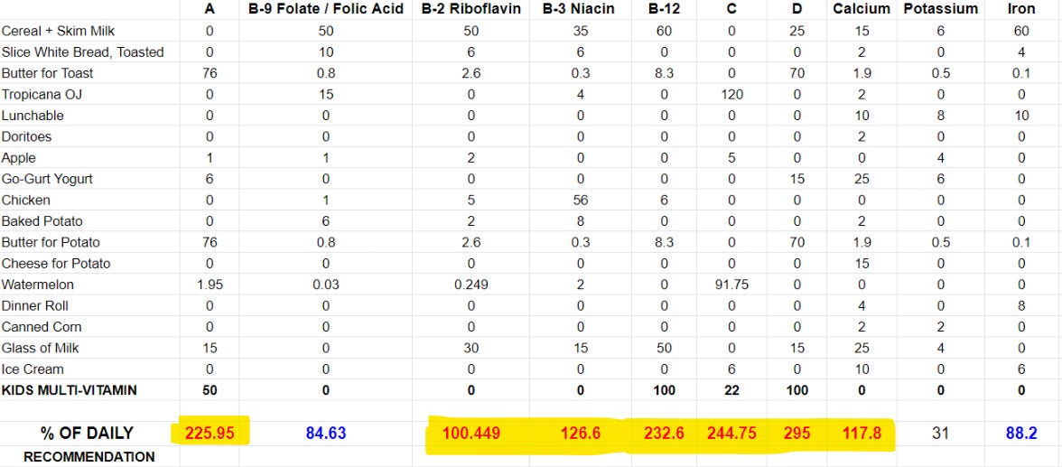 And if you’re not sure if you are hitting Big Pharma’s Daily Recommended Intake levels of vitamins, therefore you are uncertain if you should be taking the lab-produced concoctions, then you need to do what I did in my article and make a spreadsheet itemizing each ingredient you consume each day then add up the totals - this is the only way to truly find out if you are taking too much (based on the levels created by the industry that sells the supplements).