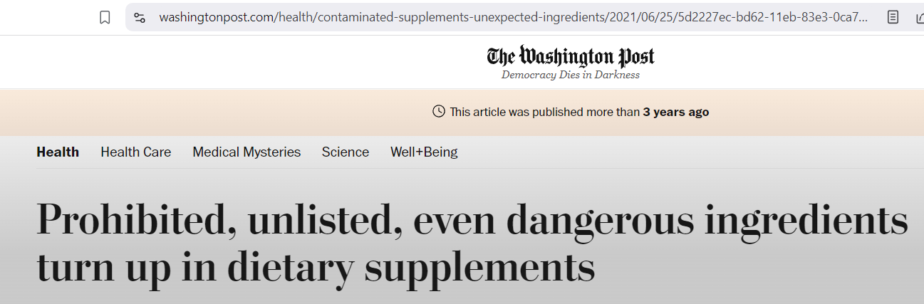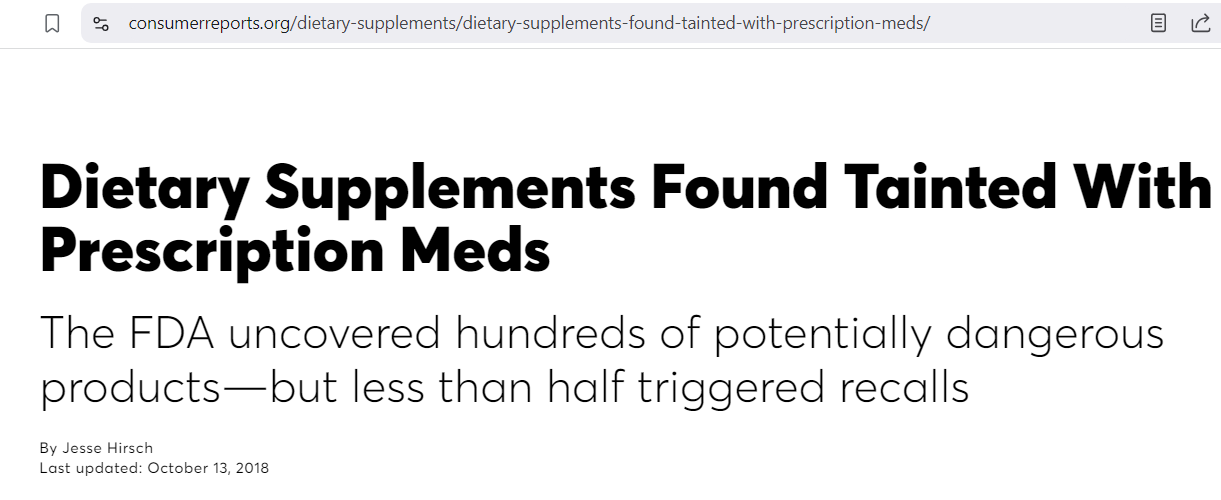 Because supplements are unregulated, the only way the FDA steps in is if the harm is so overwhelming that they are forced to do something, such as in the case of their investigation that took 9 YEARS and resulted in LESS THAN HALF of the tainted supplements being recalled: