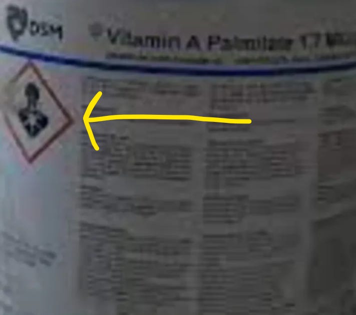 The drums of vitamins and the raw ingredients to make them usually display the skull and bones pictogram, meaning the chemical within is harmful-to-deadly.
