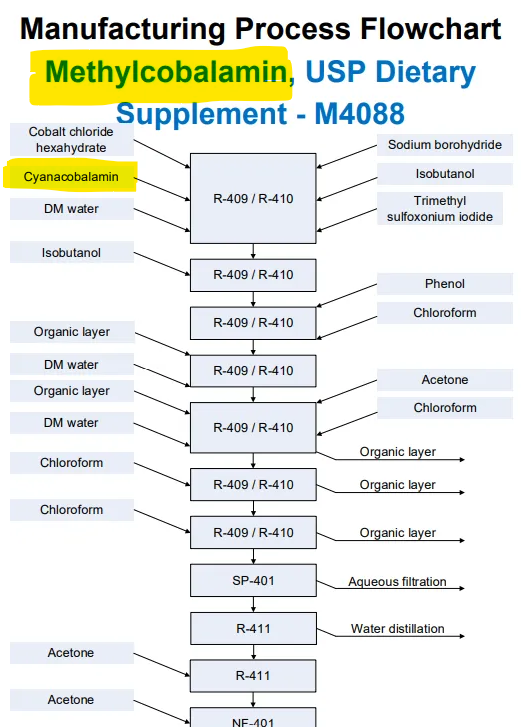 Then there’s the people who say, “I know Cyanocobalamin is made with cyanide, which is why I only take Methylcobalamin!”, but they do not realize methylcobalamin is made with cyanocobalamin. Look what they use to make this stuff: