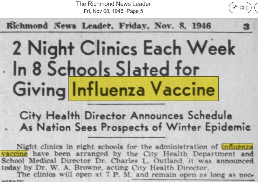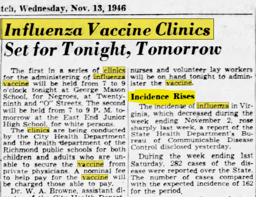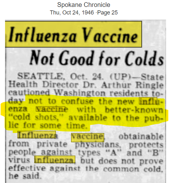 But, come fall of 1946, the State Health Director must have realized that vaccinated people were getting sick, so he made an announcement; the new influenza shot shouldn’t be confused for the cold shot which was also available. So, obviously, if you got the flu shot but you didn’t get your cold shot, that explains why you’re sick. Common sense, folks!
