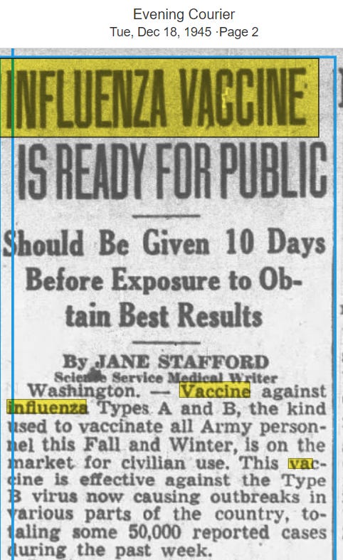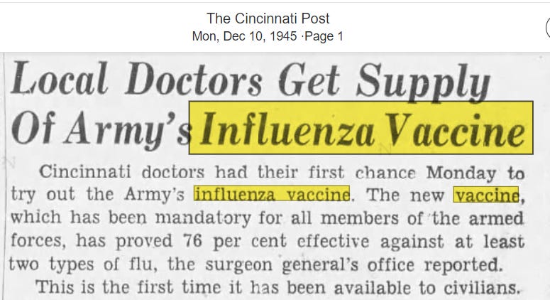 In 1938 the first flu vaccine was developed. It was important that we stuck a needle into the arms of our World War II soldiers to keep our overseas heroes safe but, disappointingly, it wasn’t working and doctors were baffled (yes, even back then they were baffled - not nearly as baffled as today, but they were baffled nonetheless). “Why on earth are these vaccinated men getting so sick?!”, they pondered, as they sipped their $20-a-glass scotch (because vaccination campaigns are very lucrative).