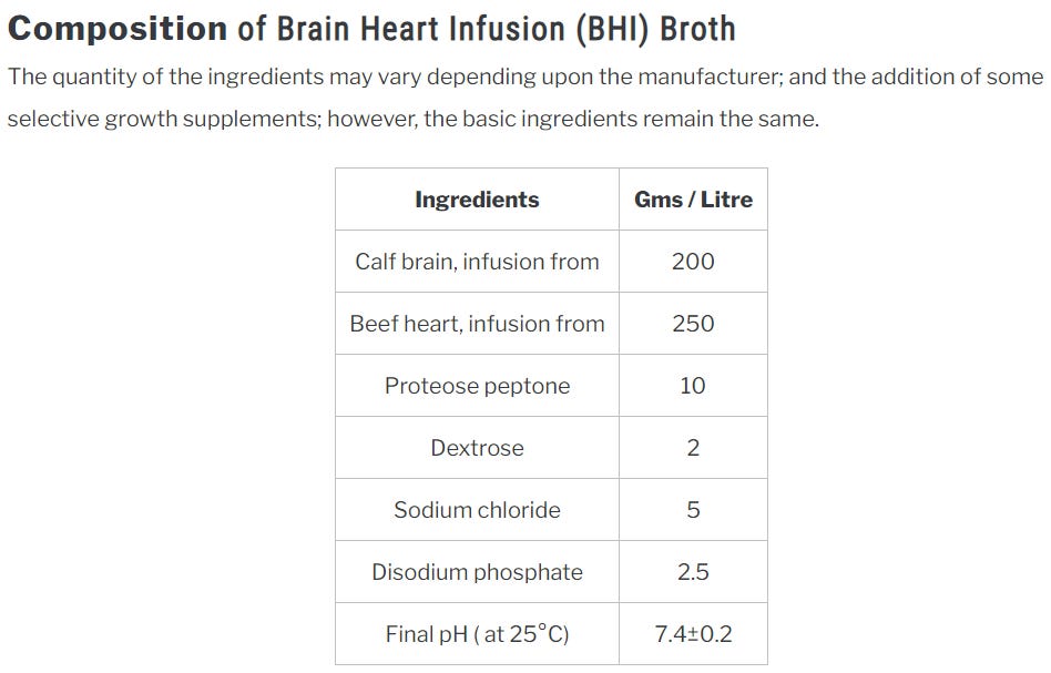 Brave Jonas obtained the virus how everyone obtains viruses - by taking “throat washings” from a patient who was sick. “Ok, so they had a sick person spit in a cup?”, you ask. No, of course not, you silly conspiracy theorist! They obtained throat washings, also referred to as garglings, by dripping BHI Infusion Broth into sick peoples noses. Puzzled, you inquire, “What exactly is this so-called infusion broth?”. To which I exclaim, “Exactly what is needed to extract the virus! It’s calf brain, beef heart, lab-made salt, stuff isolated from cow’s milk, you know, stuff like that. Virus extractor stuff.”