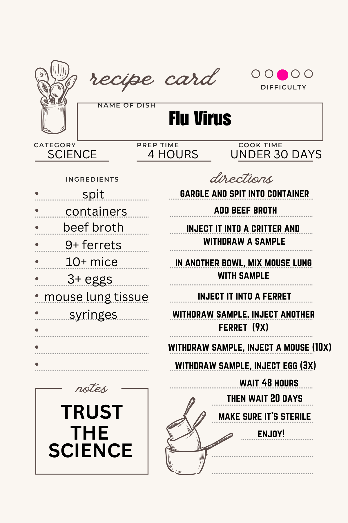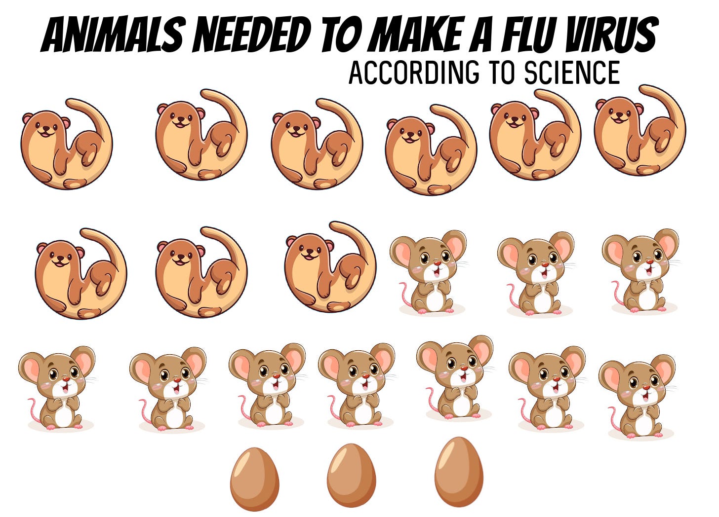 Amazing Dr. Salk then gathered “frozen and dried mouse lung tissue” and got the chemical-baby-calf-brain-cow-heart-ferret-injection-and-withdrawal serum back out. He combined the mouse lung and scientific concoction together then injected it into a ferret. To be clear, this is a second ferret because their lab is in the back of a pet store because you never want to use the same ferret twice in a row, it’s bad form. Then he withdrew blood from ferret #2 and injected it into another ferret. This ferret process was repeated nine times in a row, then he withdrew blood from the 9th ferret and injected it into a mouse, withdrew that, injected into another mouse, 10 times in a row. Now this fluid, which is on the verge of turning into a bad virus, is supposed to be made from human-spit-chemicals-baby-calf-brain-cow-heart-ferret-mouse-lung that has been in at least 19 different animals. It was at this time that he knew what had to be done to complete the transformation into a full virus - inject it into a chicken egg embryo, withdraw it, inject another egg, and repeat that process three times in a row. Then he injected that into an alligator - I’m just kidding! That would be ridiculous! This recipe is only ferrets, eggs, mice, beef broth and spit. Since you’re not Bill Nye or Dr. Fauci this might be confusing so I made you a graphic:
