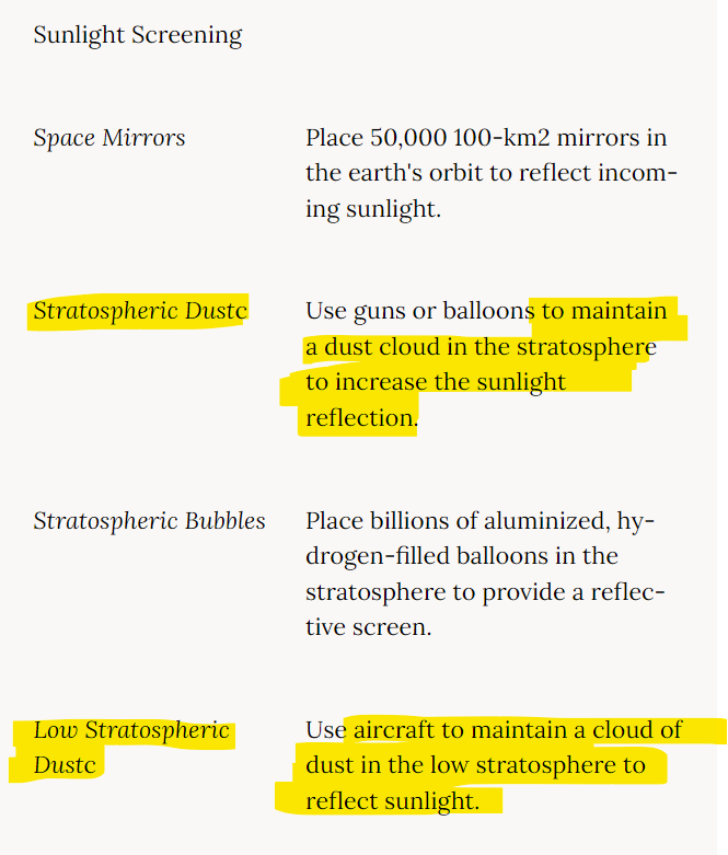 “Stratospheric Dust”, which would involve reflective particles being blasted into the sky using guns or expelled from balloons, because that’s not batshit crazy or anything. Maybe they can hook up with biological warfare expert, General Mills Cereal, and use some of their spy balloons?