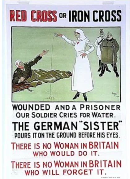 Next, “atrocity propaganda exploiting sensational stories of rape, mutilation, and wanton murder of prisoners by the Germans filled the Allied press. The German and the Austro-Hungarian soldiers were depicted as inhumane savages, and their barbarity was emphasized as a way to provide justification for the war.”.