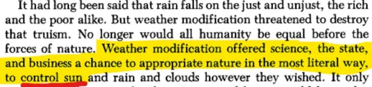 …that Right must be overruled when the government is modifying the weather for the benefit of the people. The Judge ruled that because of this, weather modification must be permitted. He went on to point out that property rights, although including air rights, do not include weather rights. He stated that there is no way a property owner can own the weather on their land.