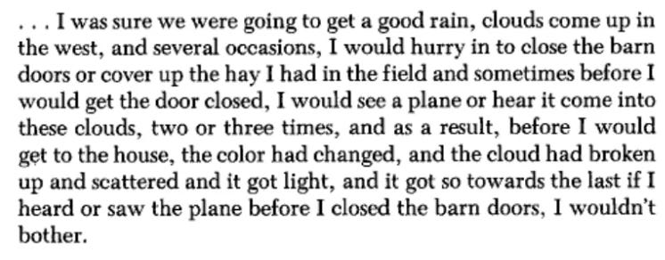 Lewis Gordon, a farmer from Big Cove Tannery, told a similar story. He too watched storm clouds start to blow in from the west. He then saw a plane appear in the sky and “in a few minutes, the cloud just broke up in small parts and went north and south and that was it”.