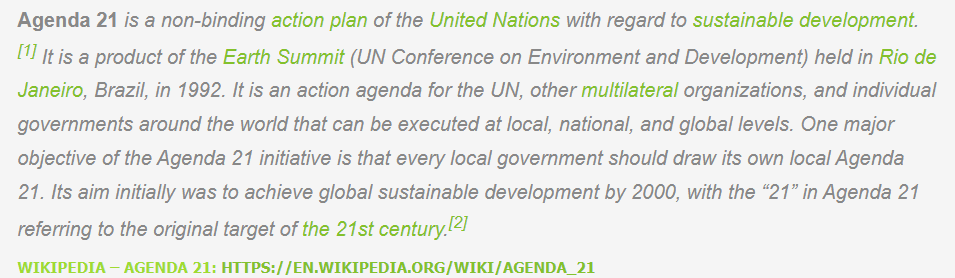 If you look up the definition of Agenda 21 on Wikipedia, it’s a really beautiful, heartwarming and thoughtful plan to protect mother earth. It’s about loving the planet and saving her from terrible people who are murdering her through Climate Change. I think we all can agree that we do not like pollution, so this plan is GREAT! … right?