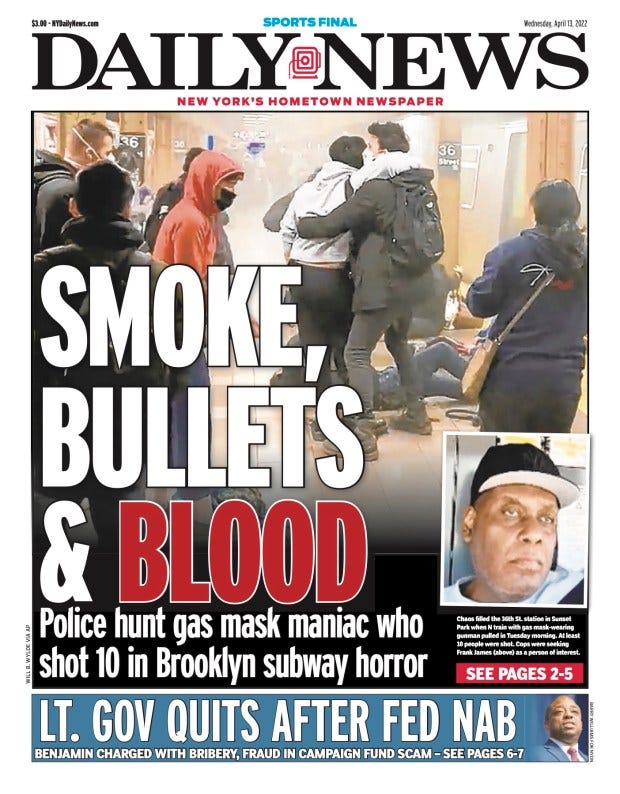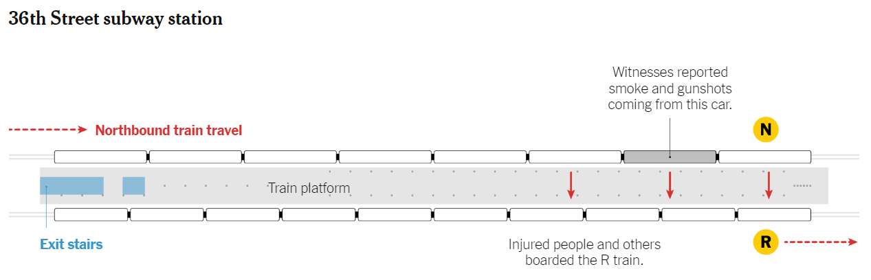 “On the morning of April 12, 2022, a mass shooting was committed on a northbound N train on the New York City Subway in Sunset Park, Brooklyn, New York, United States. At approximately 8:24 a.m. EDT, a 62-year-old Black nationalist Frank Robert James put on a gas mask, threw two smoke grenades, and fired a handgun 33 times. The shooting occurred as the train was traveling between the 59th Street and 36th Street stations.