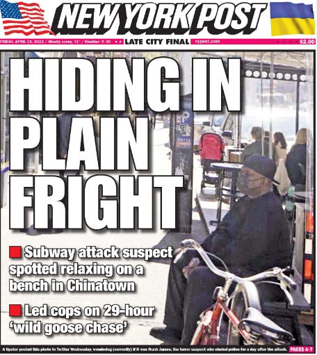 Although no one died, 29 people were injured; ten victims were hit by direct gunfire, while the remaining injuries were from smoke inhalation. Most passengers disembarked at 36th Street, where some passengers fled onto an R train that traveled one additional stop to 25th Street. On the day after the attack, Frank James was arrested as the suspect after a large manhunt.” …and do you know where he was hiding when they caught him? On a park bench: