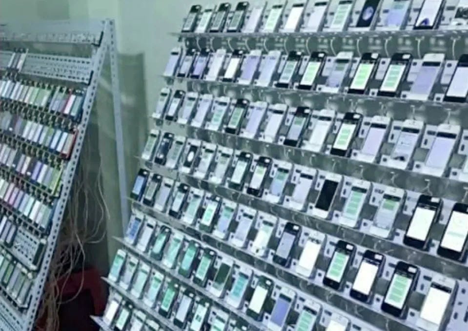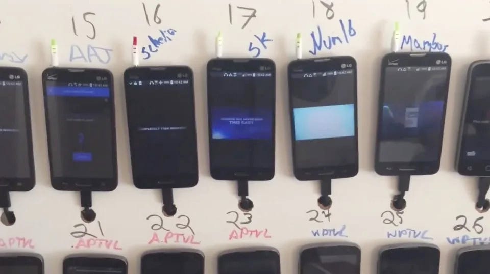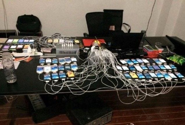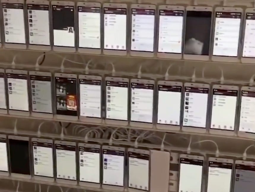 As shown in the video above, a single (fake) account can post 350+ times PER DAY, just on Twitter. This isn’t factoring in Facebook or other platforms they are also utilizing. That means a room full of phones, like this…