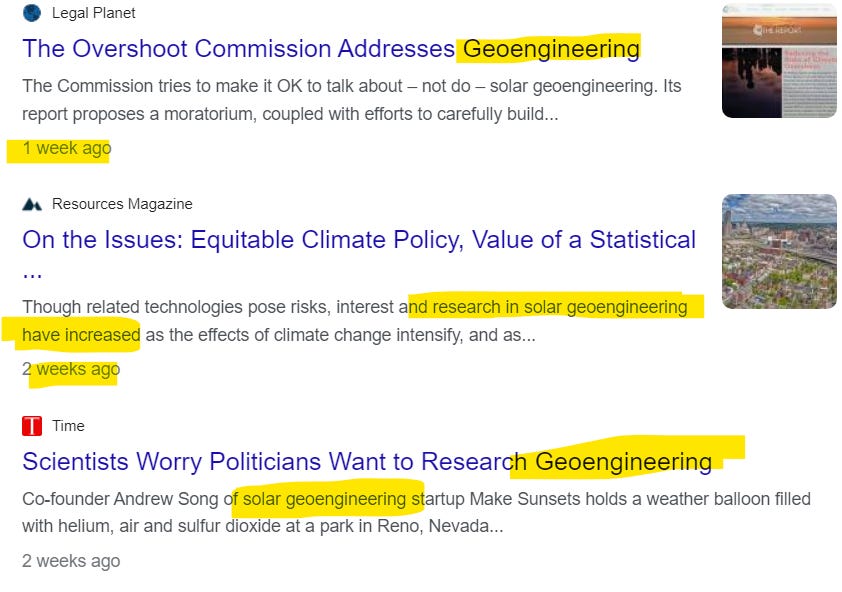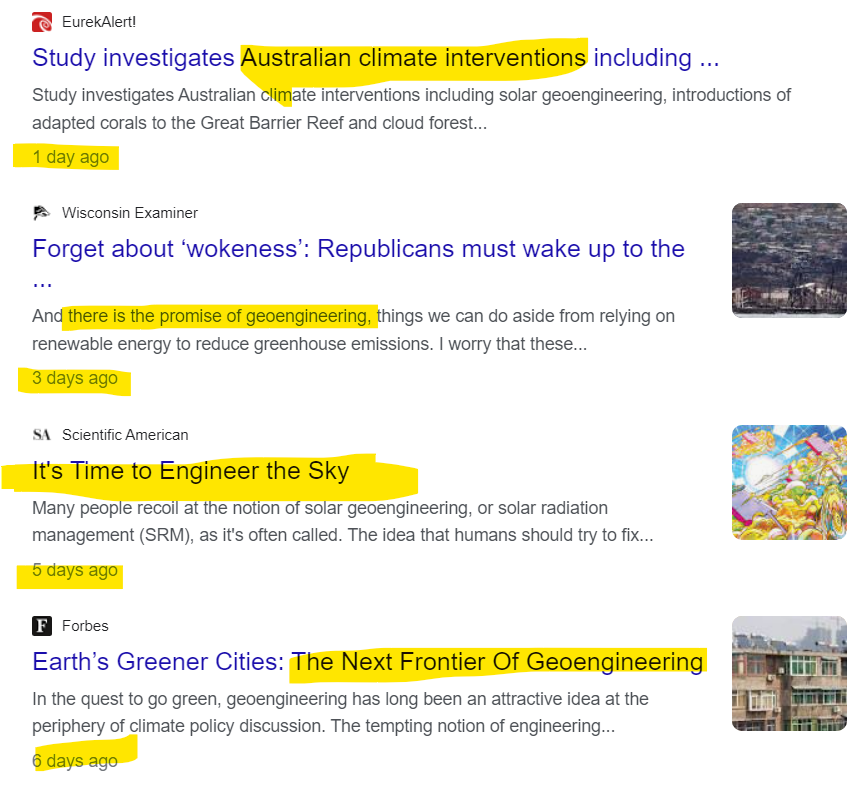 As you likely already know the media is owned by only a couple master entities (including the government) and they crank out content in unison. This means a person, like my life-long friend Paul, assumes something is true because he saw it on 7 different sites in one day, and “they can’t all be lying”. While writing this article, I looked up GeoEngineering News and discovered every single mainstream outlet was pushing, “its time to start GeoEngineering to stop Climate Change”. Yep, every publication from the New York Times to Forbes to the Washington Examiner had all created nearly identical pieces within the past four weeks:
