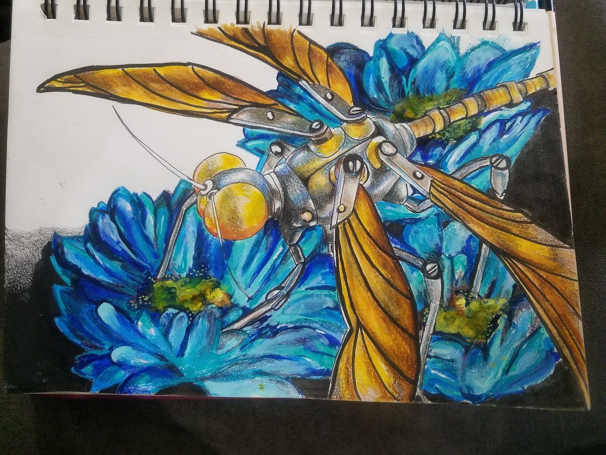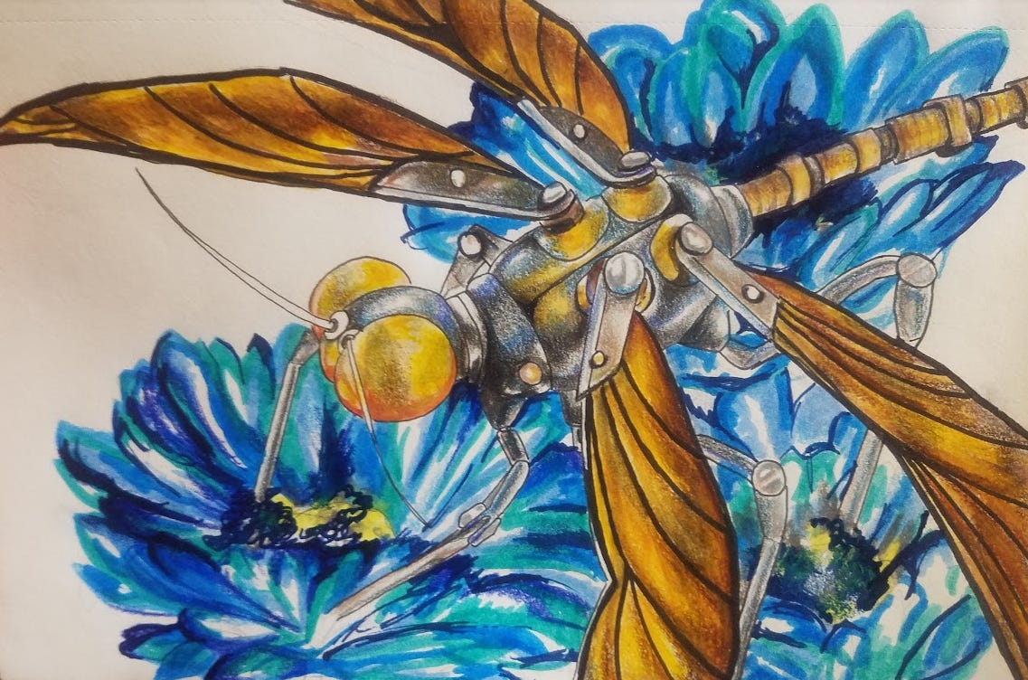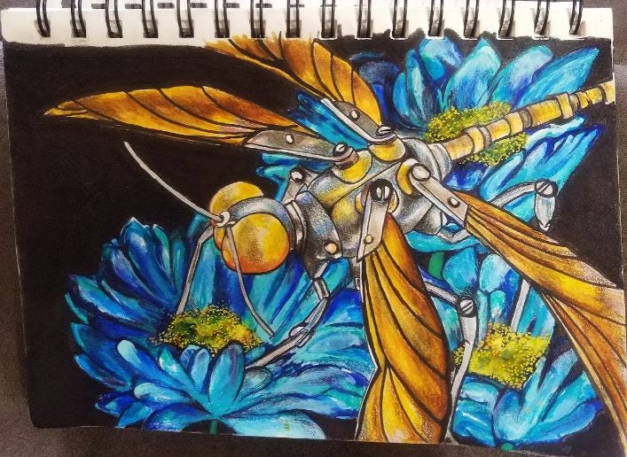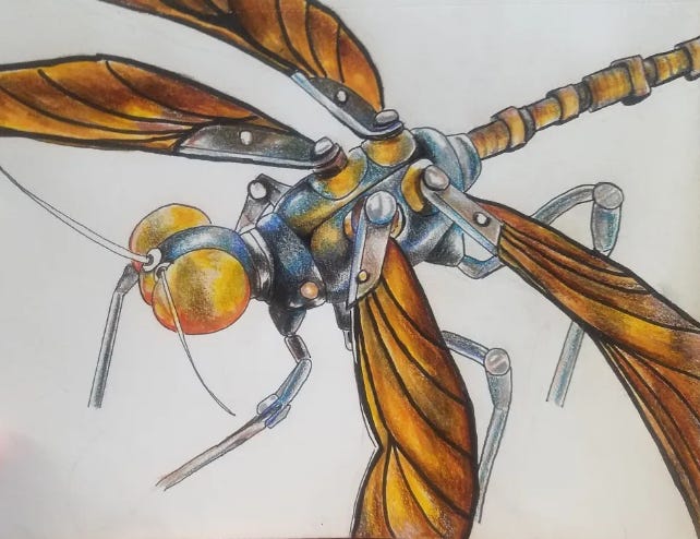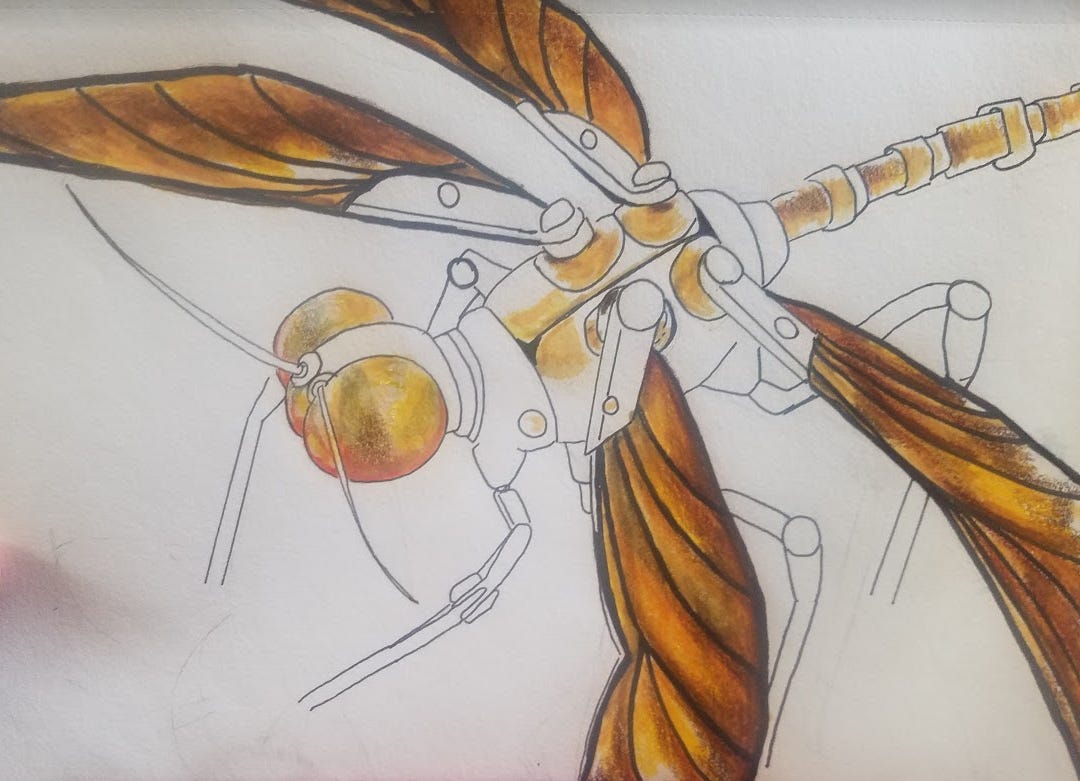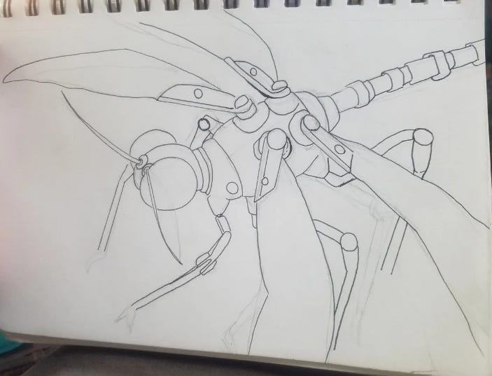 Now here’s the part of the post where I ask you to give me money or your email address, but I also wanted to tell you, I drew a robot insect. You can see my art below (see how I’m forcing you to scroll past my donation boxes? Clever.)