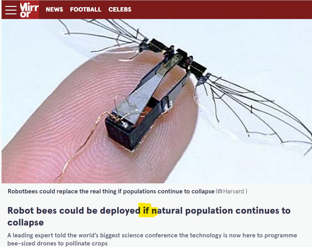 2023: Now robot bees are being peddled as Artificial Intelligence, and, as you already know, AI is a keystone to Agenda 2050… nothing natural can remain.