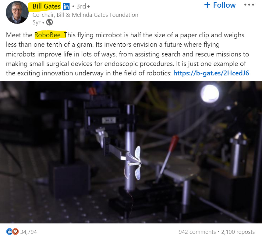 Also 2018: The Mirror promoted Bill Gates robobee but doesn’t mention Gates at all. The Mirror says, “Fleets of robobees could now be deployed if natural populations continue to collapse.” … did you notice, they are now saying “if”… leaky faucet, drip… drip… drip…
