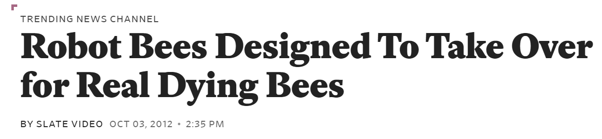 Predictive Programming: There is a theory that the government and other higher-ups are using movies and books as a mass mind control tool to make the population more accepting of planned future events. Predictive Programming can also be as simple as throwing the idea out there in the media far in advance, then, like a leaky faucet, proceeding to drip it out over time. Below I am going to show you a timeline of Robot Bees going from a wacky idea to our saving grace, within a handful of years, while all along they were GeoEngineering insects to death. As the timeline will show, by 2023, they began outright slaughtering hives in the name of “safety”.