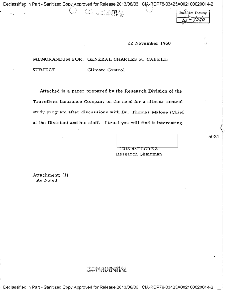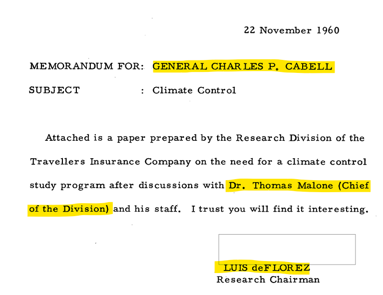 During his time on the board of Travelers Weather Research Center, Luis de Florez was in communication with Player #1, Charles P. Cabell, the Deputy Director of the CIA. The topic of conversation was weather warfare, and, more specifically, the need for it. Keep in mind, the guy rooting for weather war is ON THE BOARD OF AN INSURANCE COMPANY… an insurance company who excludes Acts of God.