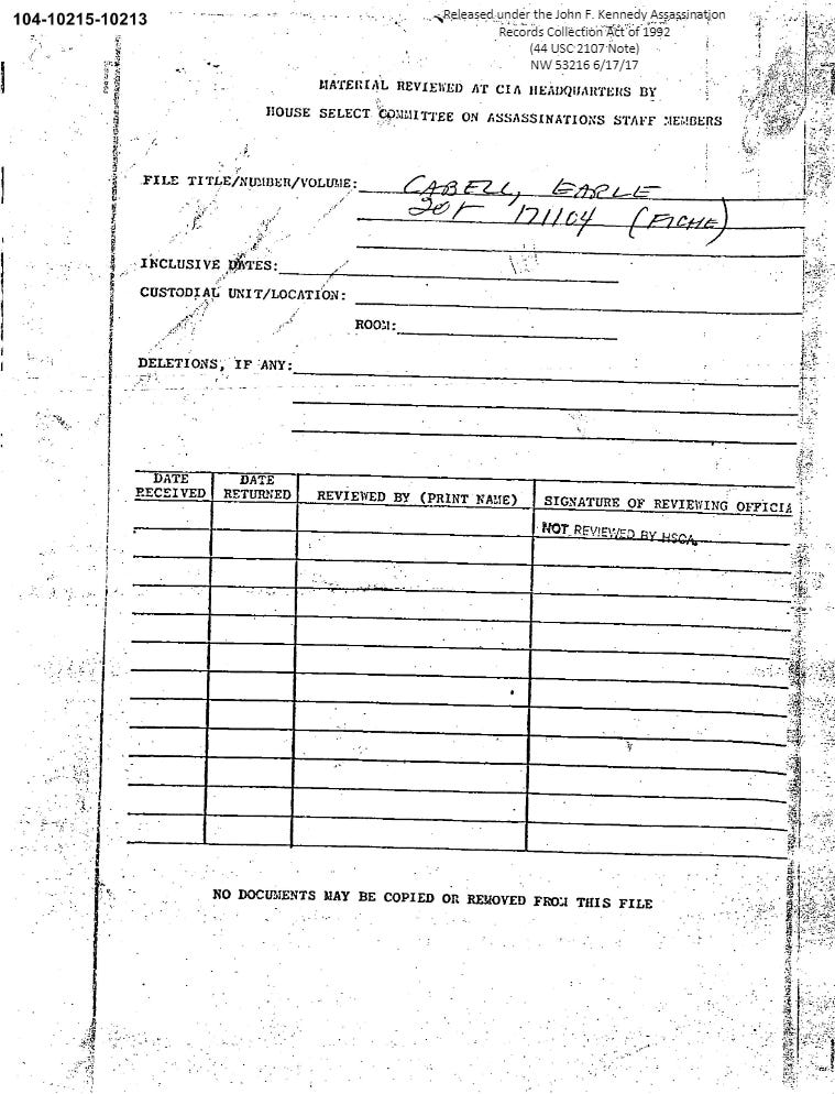 So, guess who Charles Cabell’s brother was? Earle Cabell. Earle was not only the mayor of Texas, but also secretly on the CIA’s payroll as an Asset. We know this to be a fact because in 2017, the shocking CIA Secrecy Agreement with Earle Cabell was declassified. This is the CIA 201 file cover sheet: