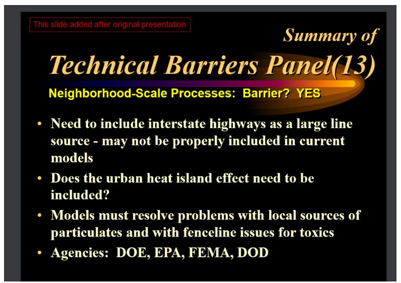 In the “Technical Barriers” section subtitled “Neighborhood-Scale Processes” they suggest using interstate highway roads as “large line sources”, apparently, at the time, these roads were not being utilized. Here they state the Dept of Energy, EPA, FEMA and Dept of Defense have the capabilities: