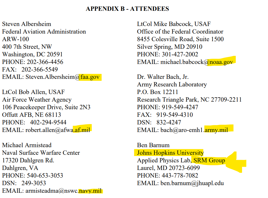 A couple of the main attendees who sent multiple representatives include: The FAA (who oversees flights), the military (air force and the navy who has a history of spraying chemicals from the sea, usually on unknowing citizens or their own soldiers), the Johns Hopkins “SRM Group” (SRM? Does this mean Solar Radiation Management? As in using chemicals to block the sun? The same Johns Hopkins who literally offers GeoEngineering degrees?), NOAA.gov (who oversees GeoEngineering projects, such as the current 200-year “Make Sunsets LLC" operation)…
