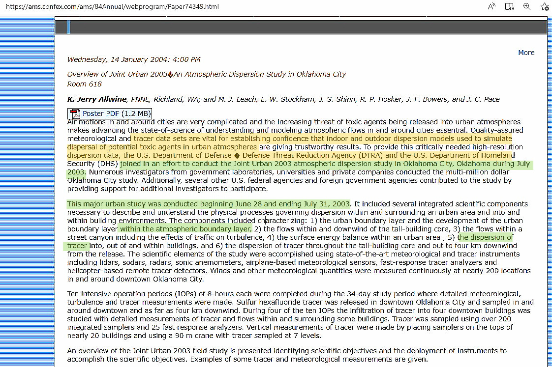 Right? Well, this is not what model means when the government (military included) uses it. As shown on many documents, model can also mean a physical operation taking place, often called a Trial or Field Trial. Below is a 2004 document titled Overview of Joint Urban 2003: An Atmospheric Dispersion Study in Oklahoma City. This document details the models which were, “Ten intensive operation periods of 8-hours each completed during the 34-day study period where detailed meteorological, turbulence and tracer measurements were made. Sulfur hexafluoride tracer was released in downtown Oklahoma City and sampled in and around downtown and as far as four km downwind.”
