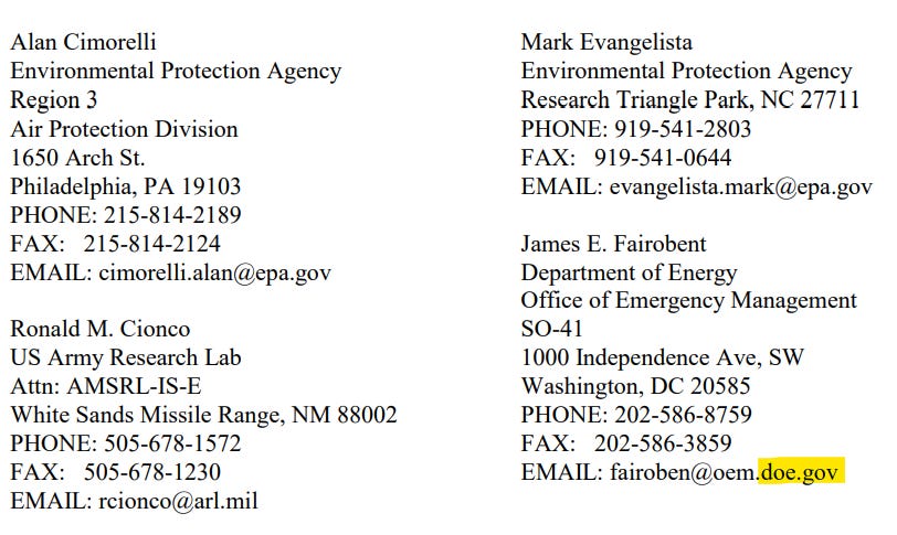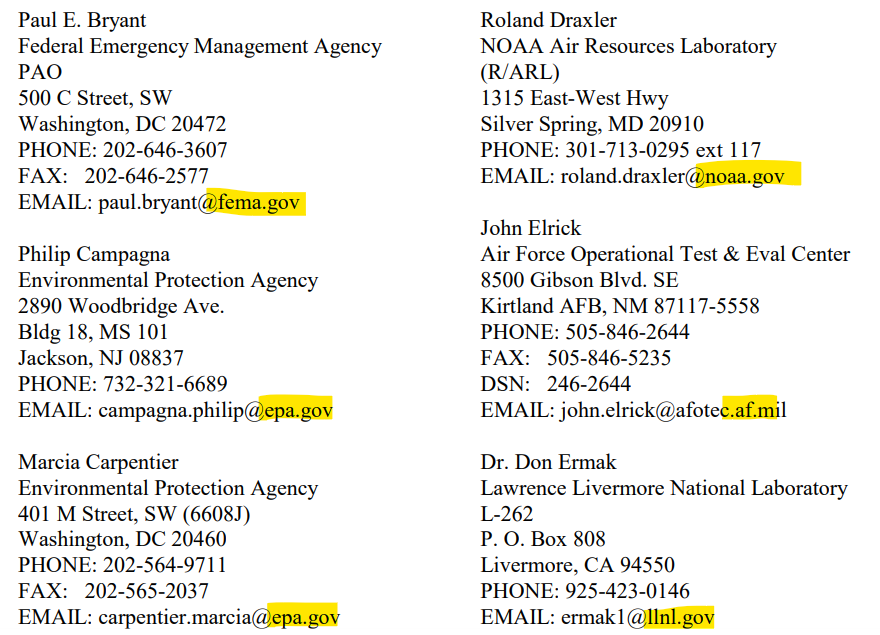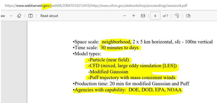 Their models were based on the dispersion of “particles” into NEIGHBORHOODS for 20-30 minutes per session. They stated the agencies with the capability to accomplish this task are the Department of Energy, the Dept of Defense, the EPA and NOAA: