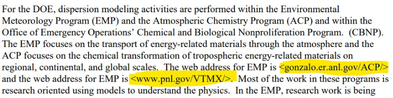 “...the Department of Energy (DOE), dispersion modeling activities are performed within the Environmental Meteorology Program (EMP) and the Atmospheric Chemistry Program (ACP) and within the Office of Emergency Operations’ Chemical and Biological Nonproliferation Program. (CBNP). The EMP focuses on the transport of energy-related materials through the atmosphere and the ACP focuses on the chemical transformation of tropospheric energy-related materials on regional, continental, and global scales.” … if these big words sound too complex, in laymen terms, it means, “chemicals in the sky that are capable of doing big things”.
