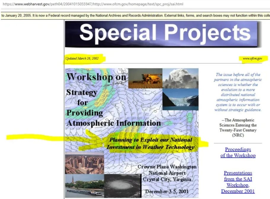 I take a deep breath then begin to explain: the Office for Federal Coordinator for Meteorology (OFCM) just so happened to quietly close in 2021, because, who needs stupid Meteorology after all, let alone a whole office to Coordinate it? I assume they thought, “After 3 bottles of red wine, Nancy Pelosi could give us a more accurate weather report than what we are getting anyway, so just close it”. So, when it closed, the government documents pertaining to it began disappearing from the mainstream internet, although I was able to pull up some fascinating documents through WebHarvest. Let’s take a peek:
