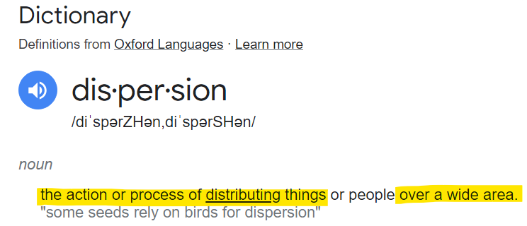 Just so we are on the same page here, the definition of “Dispersion” is, “the action or process of distributing things over a wide area”: