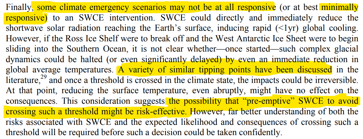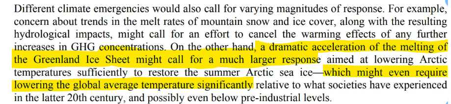 They go on to state a “dramatic” event, such as the melting of the Greenland Ice Sheet, “might call for a much larger response”, and, that such a dramatic event might require “lowering the global temperature significantly”, which means they will get the greenlight to use multiple methods of GeoEngineering, including “Chemtrails”, Cloud Brightening and more.