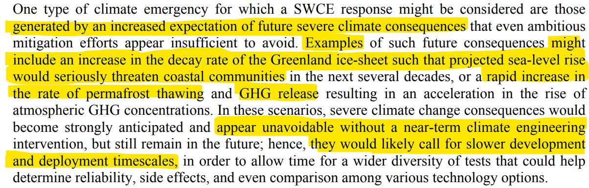 As you will notice in the chart above, Stage 3 is DEPLOYMENT of full-scale SWCE Intervention. Now keep in mind, this was authored back in 2009, at which time, other than Al Gore’s An Inconvenient Truth movie, there was no Climate Crisis or Climate Emergency… yet they somehow these authors knew they will need to deploy SWCE.