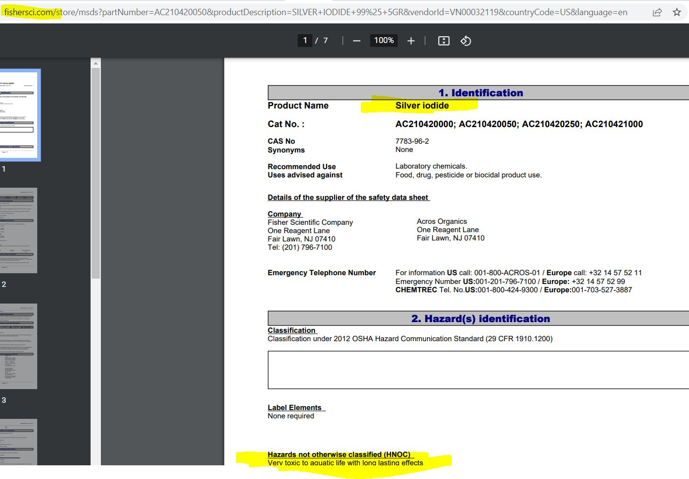 And, according to the Manufacturers of Silver Iodide (chemical), it is exceptionally toxic to aquatic life, meaning everything living in oceans, lakes, streams, marshes, etc: