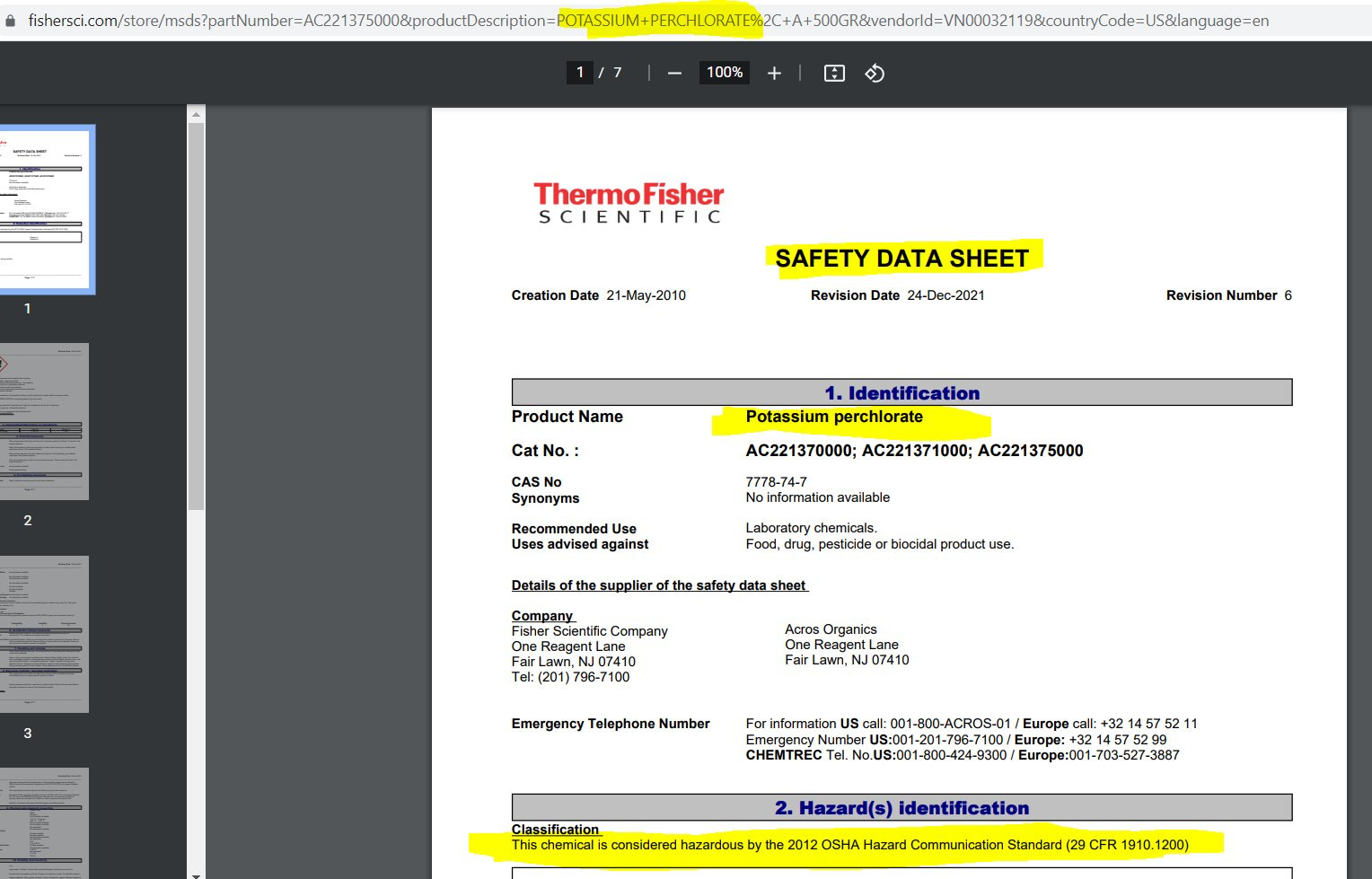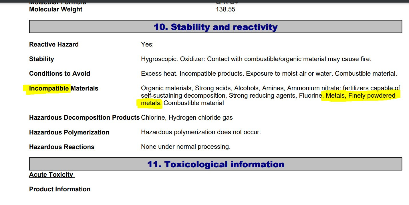 Cloud Seeding ingredient Potassium Perchlorate (CAS #7778-74-7) is a hazardous chemical according to the manufacturer Safety Sheet. It is incompatible with fine metals, which is exactly what is in Seeding and spraying operations!