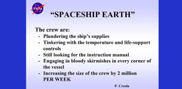 Although some slides have been scrubbed from the presentation, I happen to have screenshots of them. This document began by creepily referring to earth as a spaceship, and calling citizens “the crew”, then accusing them of being morons who can’t control themselves and are ultimately destroying earth… er, uh, “the spaceship”, I mean: