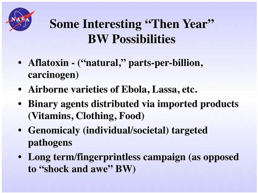 And, most importantly, in the side above, is the last line, “Long term / fingerprintless campaign”. On this substack, after I lay the foundation to explain the chemtrail program, I am going to start releasing a wealth of evidence. One common factor throughout the evidence is the phrase “fingerprintless”. The government agencies involved in these slow-kill programs often use this term. What it means is that the (killing) action cannot be traced back to them. In a future substack post, I will show you (now-scrubbed) documents from the Dept of Energy and other .gov organizations that were constructing the chemtrail program and wanted to insure that whatever they decided to put in the air was 100% “fingerprintless”. Looking again at the slide above, you can see that NASA wanted to guarantee that poisoning us, whether it be through food, “vitamins”, pathogens or via genome-tampering, that it was absolutely “fingerprintless”. Reminder: This document is from 2011. Look what has happened since: