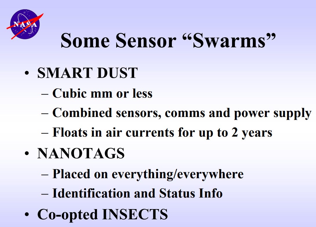 The NASA presentation goes on to cheer for Smart Dust, Nano-Tagging everything, even using insects as weapons (which they have been doing for decades)