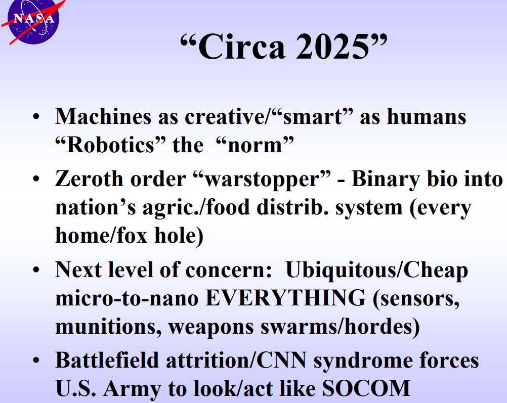 You see, back in 2011, a presentation called “Future Strategic Issues/Future Warfare [Circa 2025]” was created by the NASA Langley Research Center, Author: Dennis M. Bushnell. You can download the short version of the presentation here by clicking the PDF icon. Or enjoy my recap below. Either way, let’s jump into this terrifying document.