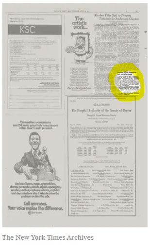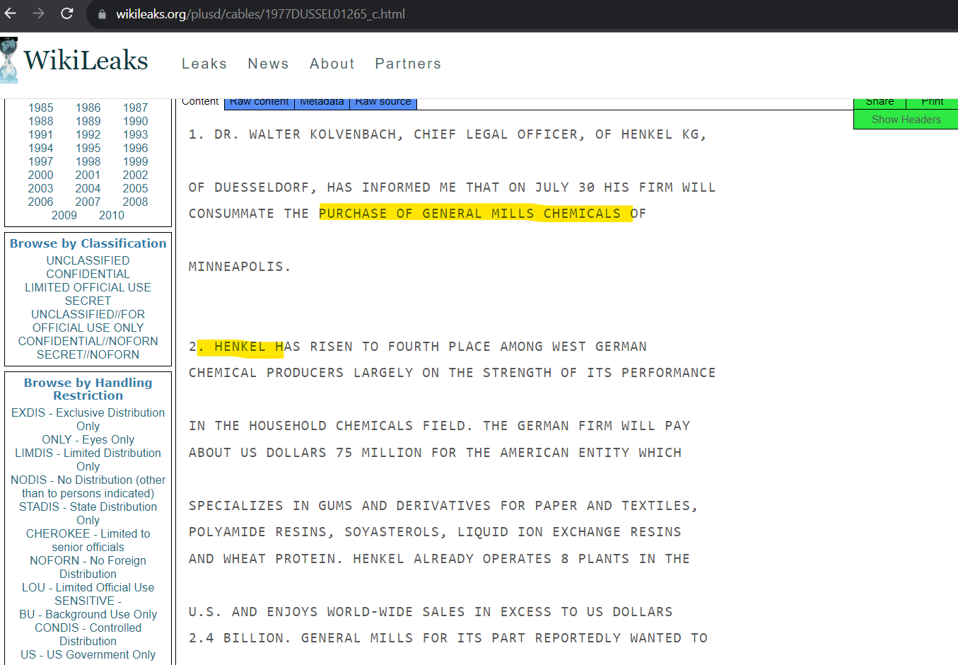 In 1977, General Mills announced that it would be selling its chemical division (you know, the one they used to make biological war agents) to Henkel. Henkel is a German company who makes Purex and All brand laundry detergent, Got2B hair care and Schwarzkopf hair dye, so when they had the opportunity to buy more chemmies, they were like “F yeah!”. Interestingly, there isn't any mention of this sale on the Wikipedia pages of General Mills or Henkel. Huh, that’s odd. There is also no mention of this on either of the company's history timelines on their own websites. All that exists regarding the sale is a tiny blurb that appeared in New York Times. It’s so small that I circled it for you, and, no, I will not pay for a NY Times membership so we can read it, but you go right ahead: