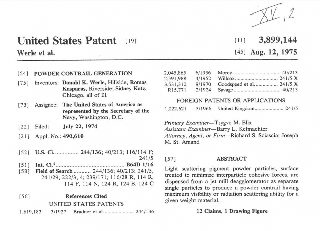 During this same timeframe, a patent was filed by the US Navy for “powder chemtrail contrail generation” :