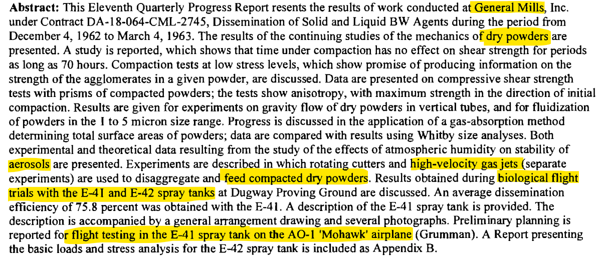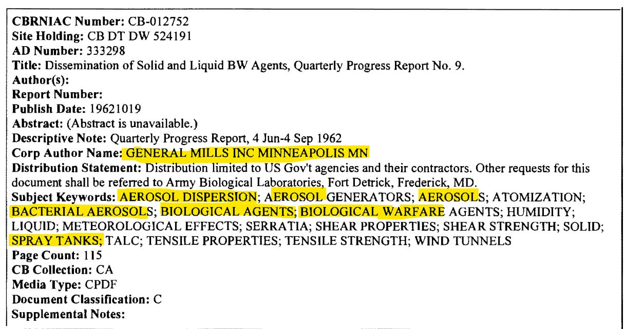 General Mills would spend the next 6+ years focused on creating powdered biological agents that were aerosolized and sprayed from airplanes (but “Chemtrails are a hoax!”, they tell me)