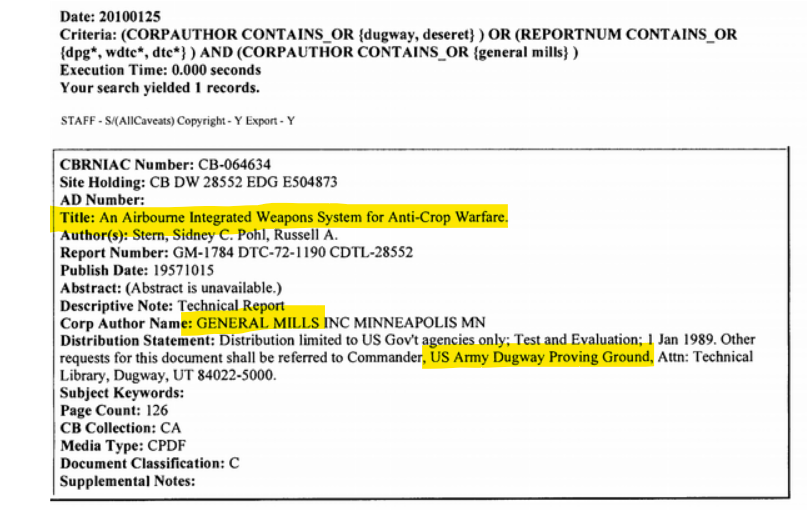 As you will see in the image above, to this day, the majority of the documents related to General Mills involvement with the Dugway are still classified, but we do know they worked on “An Airborne Integrated Weapons System for Anti-Crop Warfare", meaning killing the food supply (which sure fits with GM seeds, doesn’t it?)
