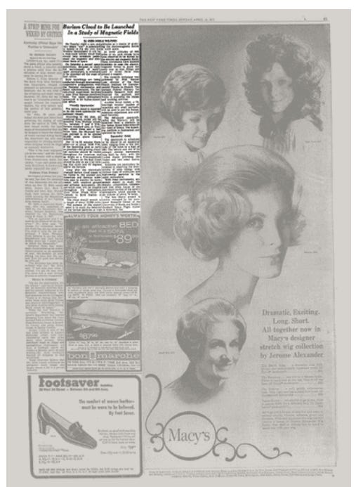 The payload was “balls of greenish-white titanium-boron-barium and barium-cupric-oxide”, which the sounding rocket released when it hit an altitude of 230 miles. The scientists were delighted to see that the barium clouds rapidly expanded, while ejecting barium ions everywhere. The cloud formed “a visible streak more than 62 miles long” (100 km).