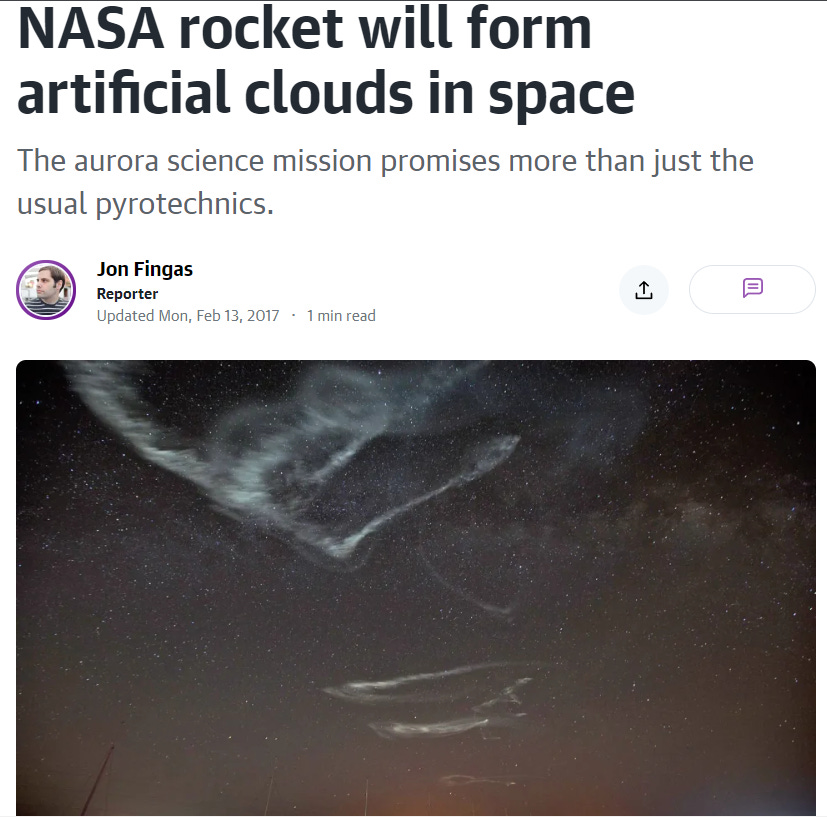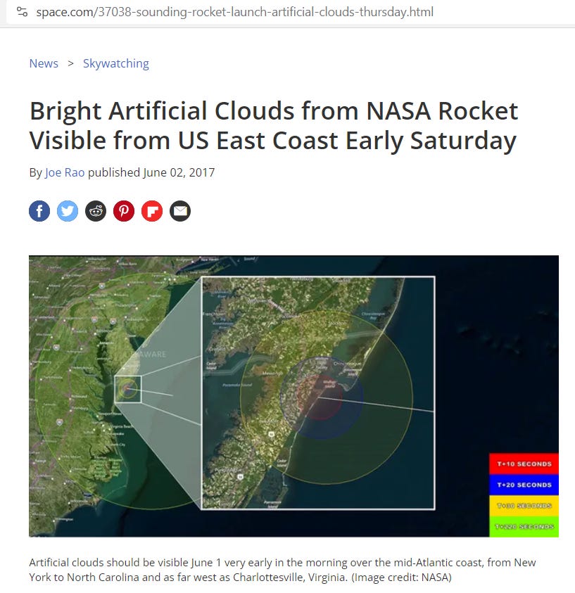 2017, “clouds of barium, strontium and cupric-oxide vapor” were released over the east coast of the USA to create “Bright Artificial Clouds”: