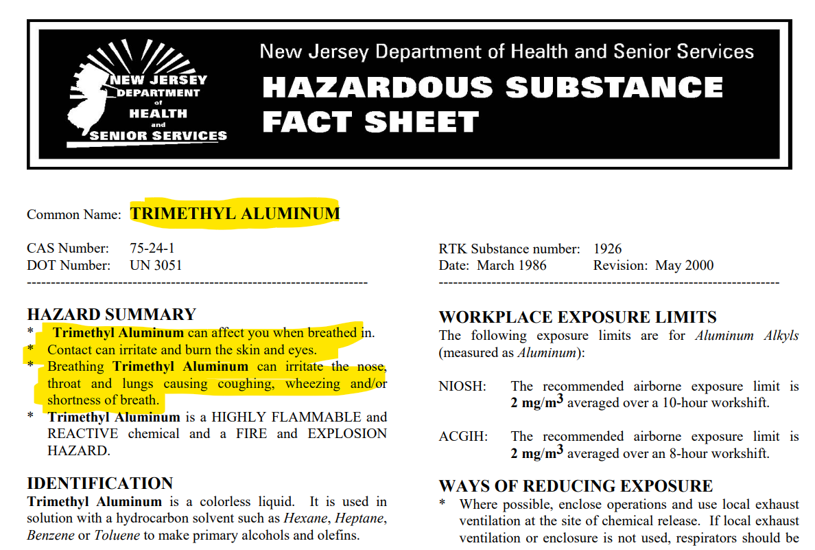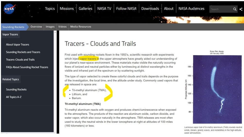 2023: To this day, NASA openly admits that it is releasing Aluminum (TMA), Lithium and Barium into the atmosphere and that these chemicals create “trails”: