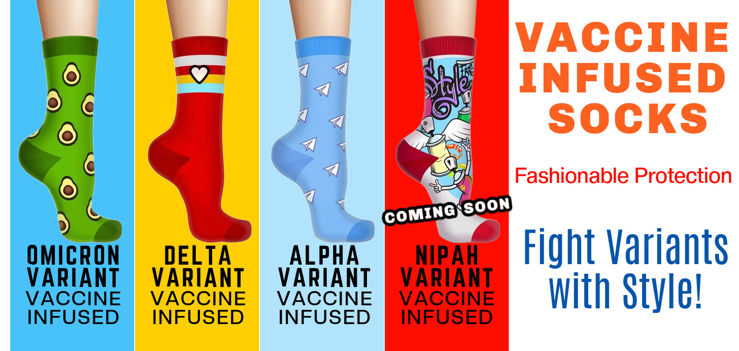Vaccine Infused Socks: These socks have been infused with virus-killing Vaccines. Fight one Variant every day of the week.